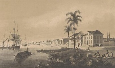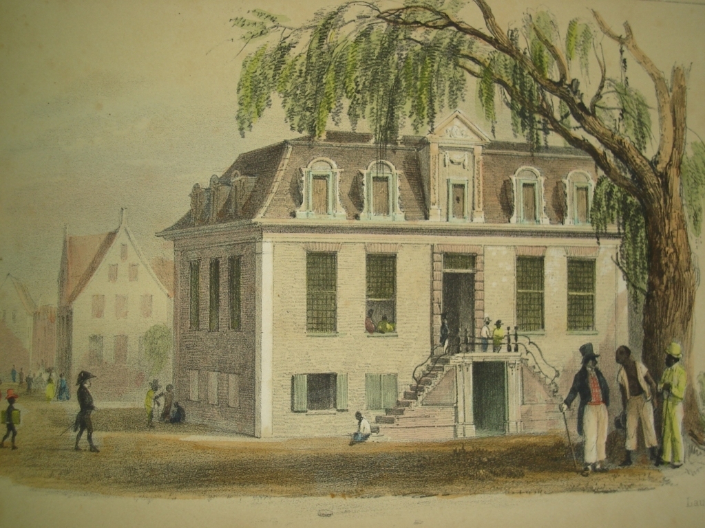 Hof van Justitie aan de Oranjestraat, in 1831 getekend door Pierre Jacques Benoit